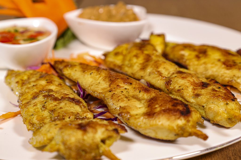 Grilled, marinated chicken served on skewers with peanut sauce and cucumber salad.