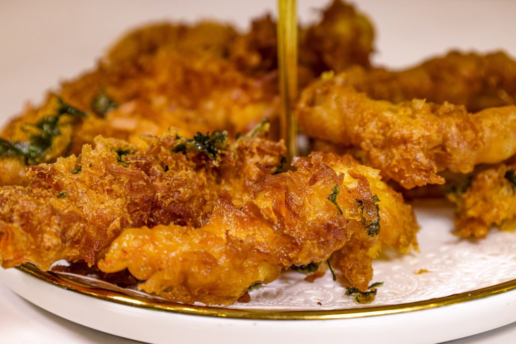 Jumbo shrimp deep fried in a coconut batter served with onion rings and french fries.