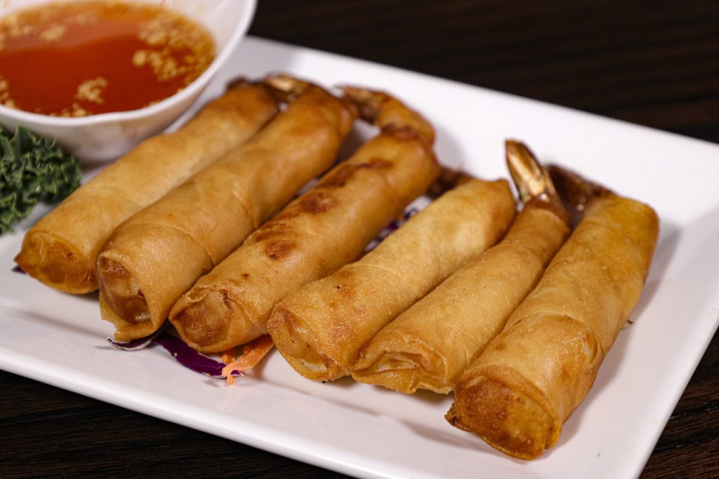 Vegetarian spring rolls deep fried served with sweet and sour sauce.