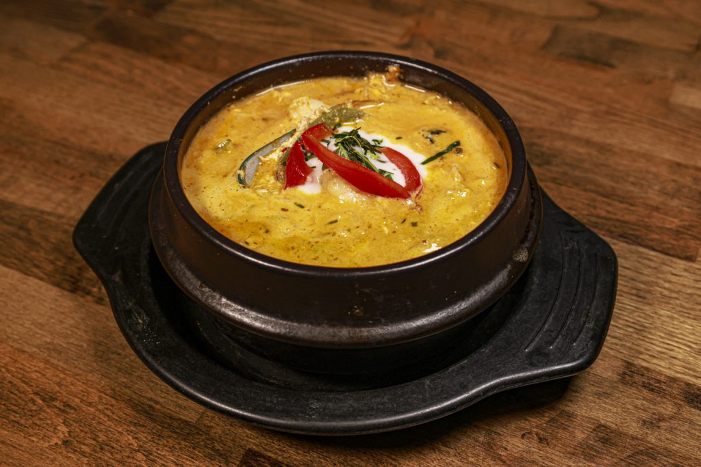 Shrimp, mussels, scallops, and squid cooked in a Panang curry sauce in a bed of mixed vegetables, served on a hot pot.