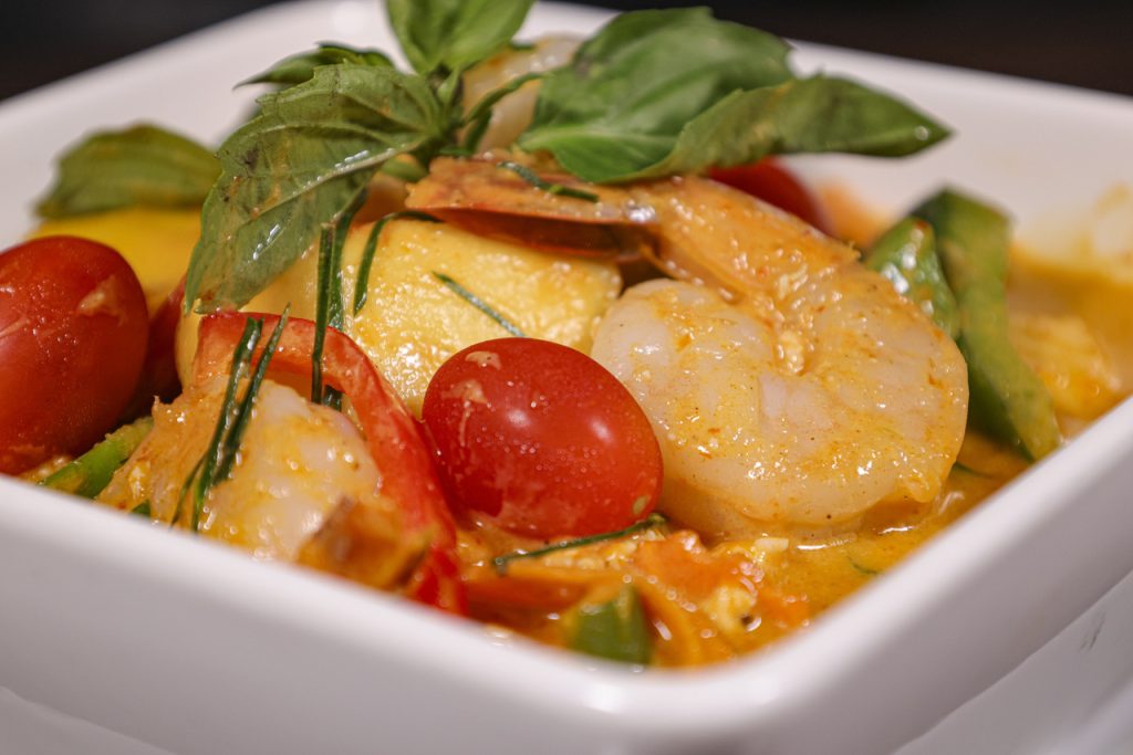 Shrimp and chicken with mango, coconut milk, bell peppers, and basil leaves.