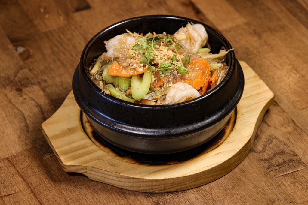Baked in a clay pot, cooked shrimp mixed with silver noodles, ginger, cabbage, and celery.