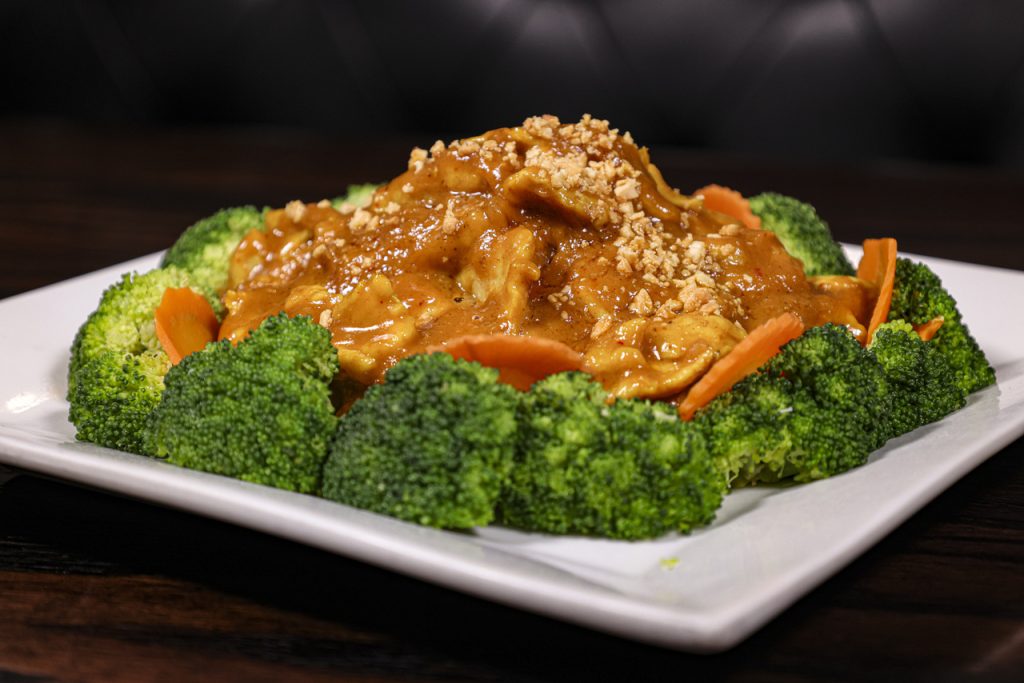 Sauteed meat in a homemade peanut sauce in a bed of mixed vegetables.