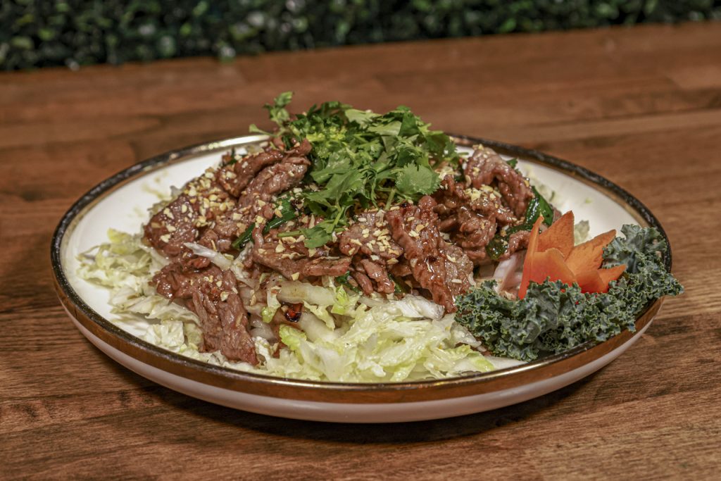 Meat stir-fried with black pepper sauce, base with sliced cabbage, onions and top with fried garlic.