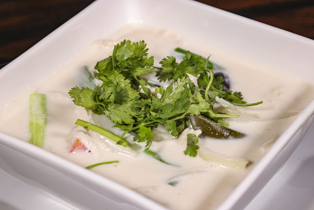 Tom Kha. Coconut milk soup with mushrooms, galangal, galangal onions, cilantro, green onions, and lime juice. C