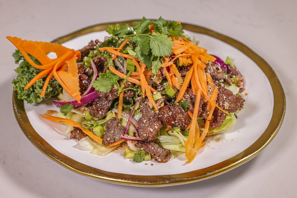 Roasted rice powder, green onions, shallots, mint leaves, and cilantro tossed with beef or pork.